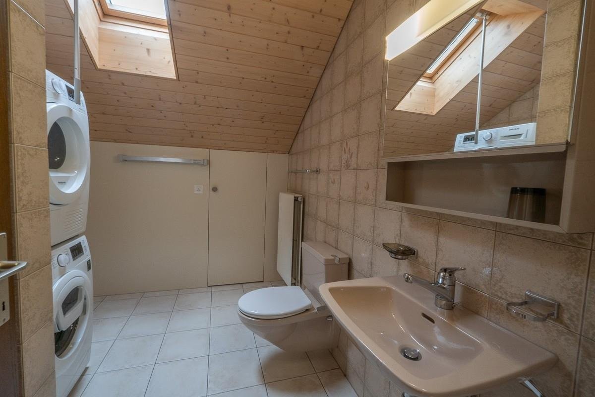 Das Badezimmer verfügt über eine Badewanne, zusätzlich steht ein separates WC zur Verfügung. Ein moderner Waschturm (Waschmaschine und Tumbler) befindet sich direkt in der Wohnung.