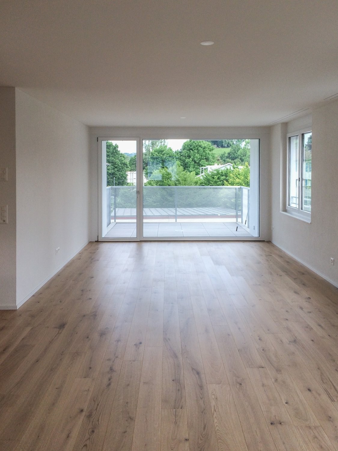 Durch die grosse Fensterfront gelangt viel Licht ins Wohnzimmer. Auf dem gemütlichen Balkon können Sie den Tag an der frischen Luft ausklingen lassen.