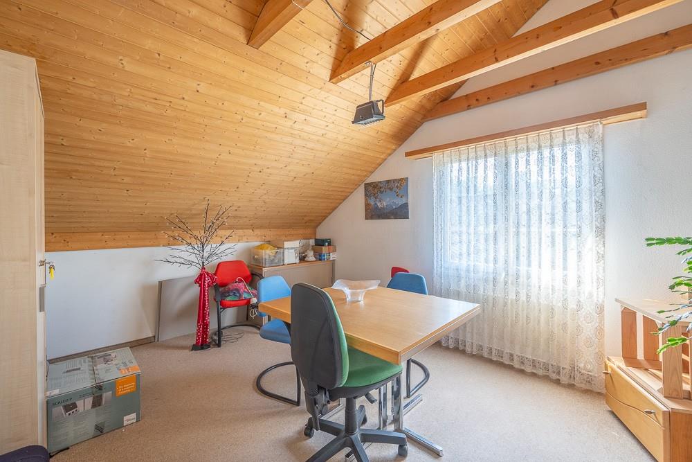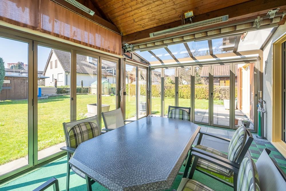 Im Erdgeschoss befinden sich das Wohn- und Esszimmer mit Cheminéeofen sowie die Küche. Ebenfalls auf dieser Etage liegen der Eingangsbereich mit WC/Lavabo, ein separates Esszimmer sowie ein grosszügiger Wintergarten. Von hier aus gelangt man in den sonnigen und sichtgeschützten Garten. Das Grundstück verfügt über einen grosszügigen Gartenbereich und bietet vielfältige Nutzungsmöglichkeiten.