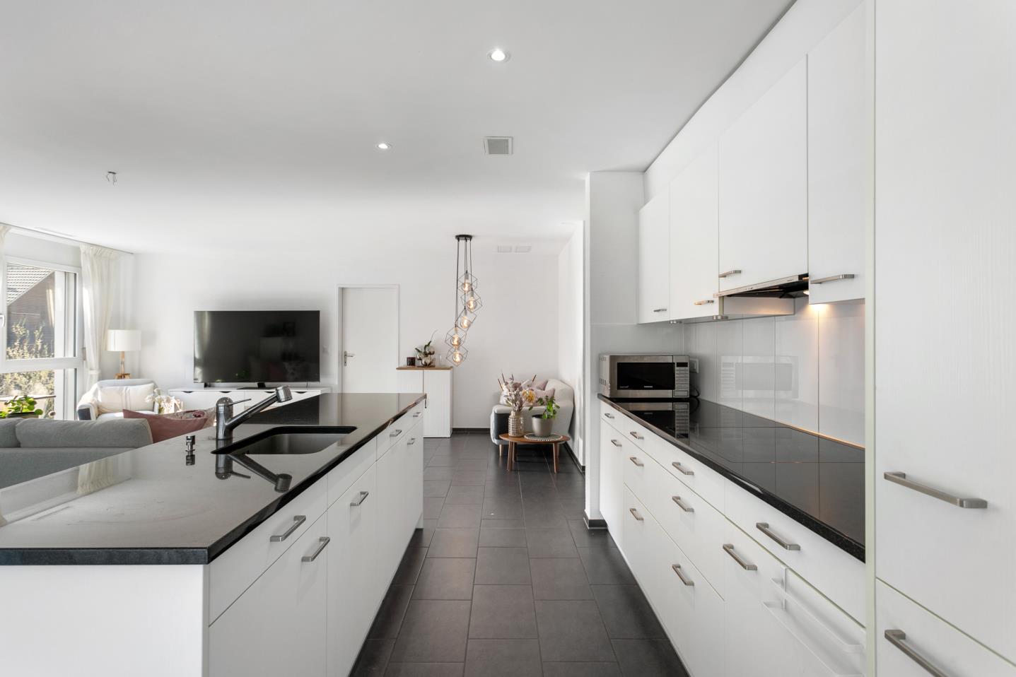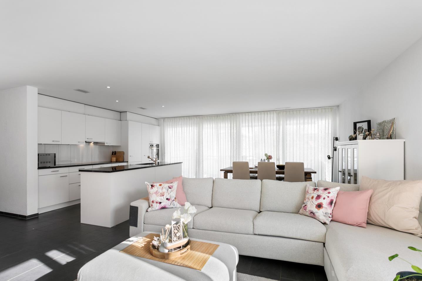 Die offene Küche mit stilvoller Kochinsel bildet das Herzstück der Wohnung und geht nahtlos in den grosszügigen Wohn- und Essbereich über. Von hier aus gelangen Sie direkt auf den Balkon, der zusätzlichen Wohnraum im Freien bietet.