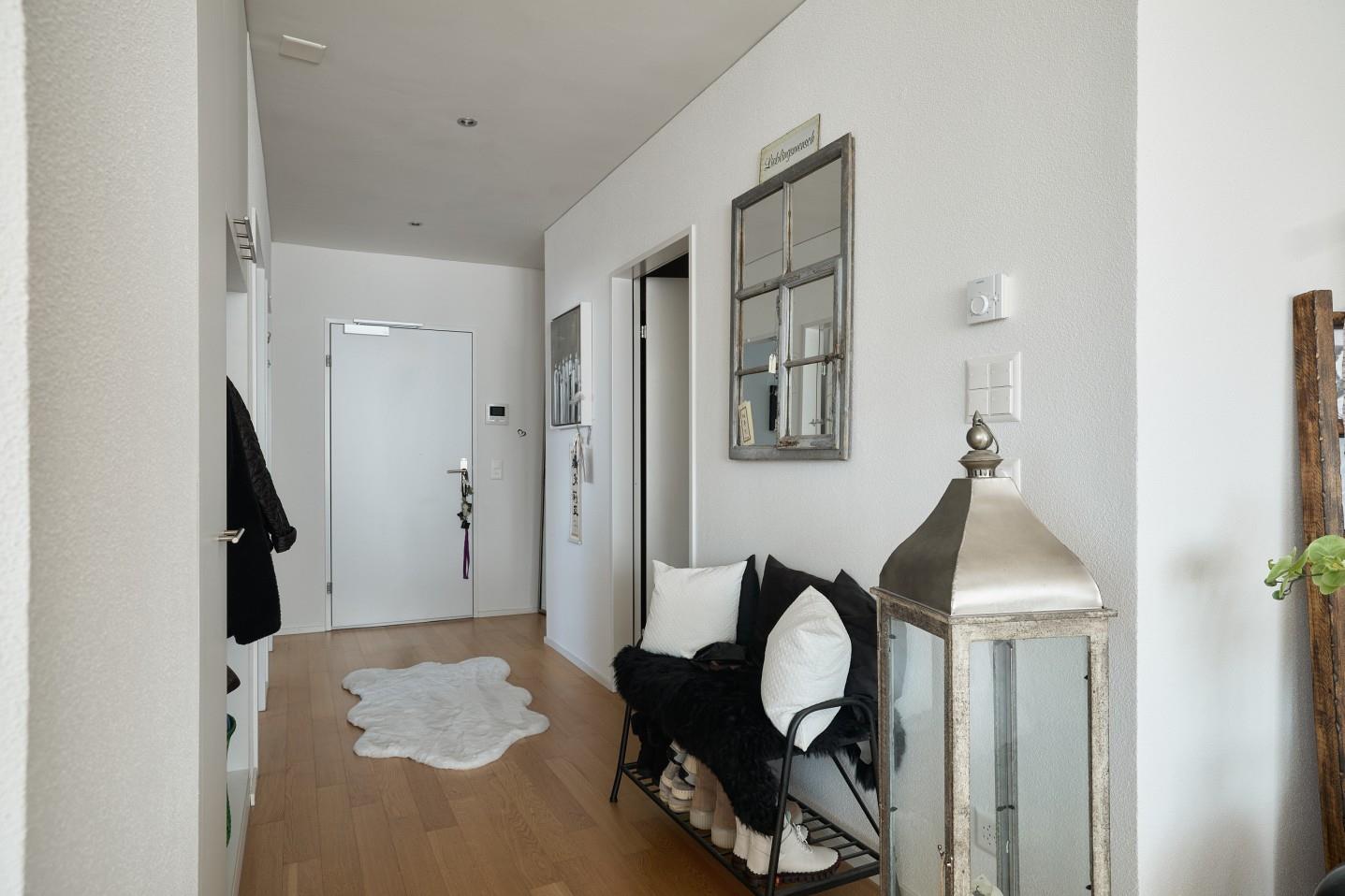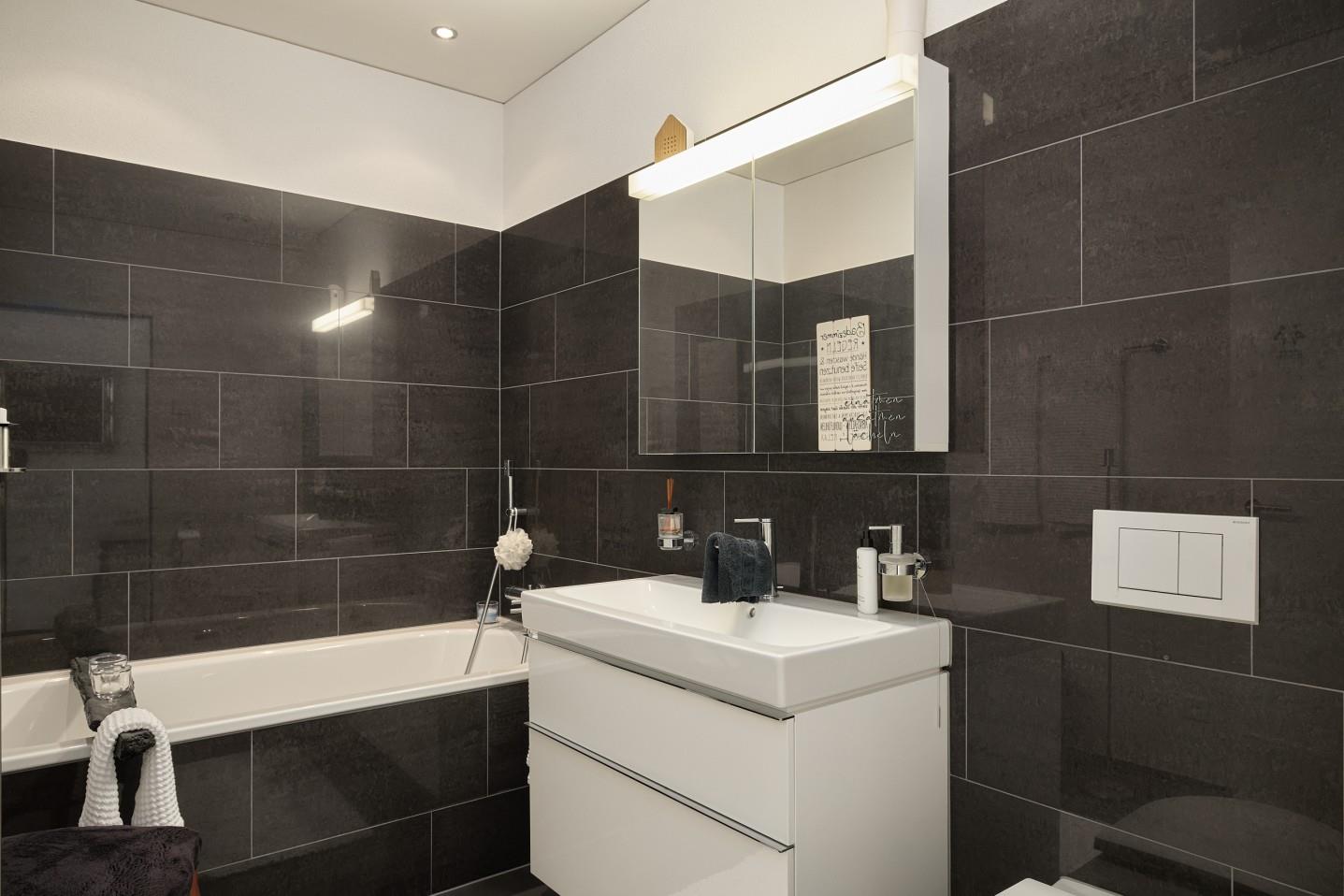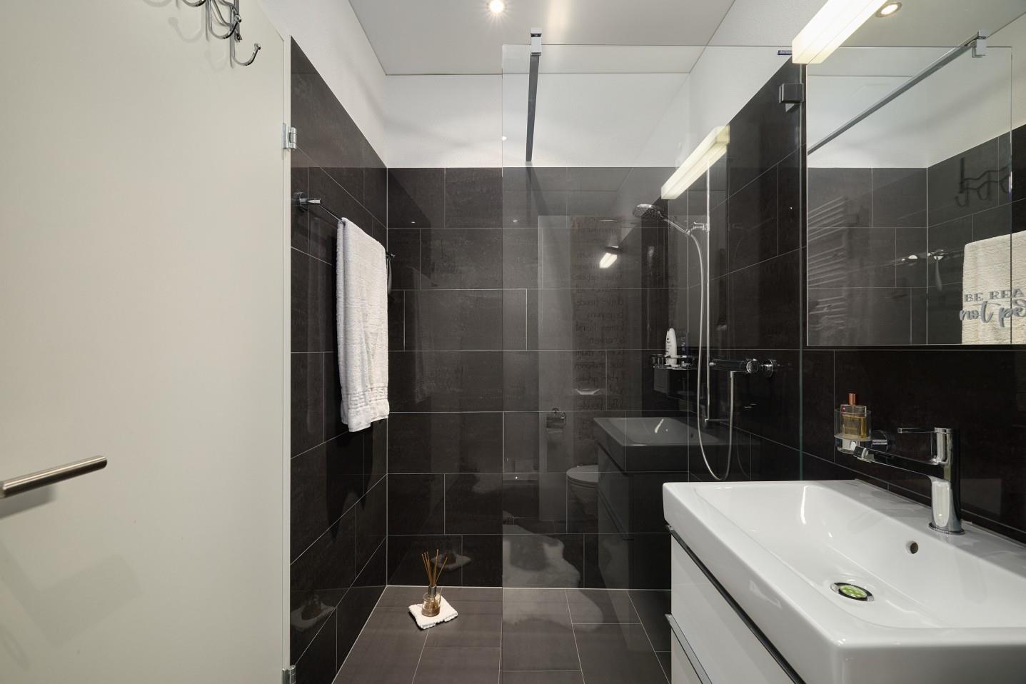 Zwei Nasszellen, bestehend aus einem Badezimmer mit Badewanne und WC sowie einer separaten Dusche mit WC, sorgen für hohen Komfort im Alltag. Grosszügige Fensterflächen schaffen lichtdurchflutete Räume und unterstreichen das angenehme Wohngefühl.