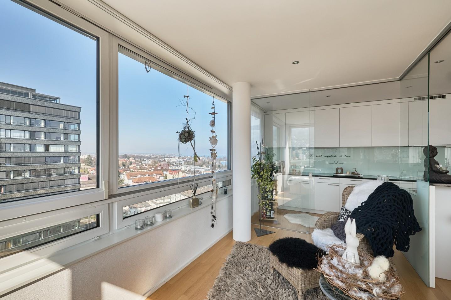 Diese attraktive 3.5-Zimmer-Eigentumswohnung im 12. Obergeschoss überzeugt durch ihre privilegierte Südwest-Ausrichtung sowie eine beeindruckende Weitsicht mit Blick auf den Bodensee.