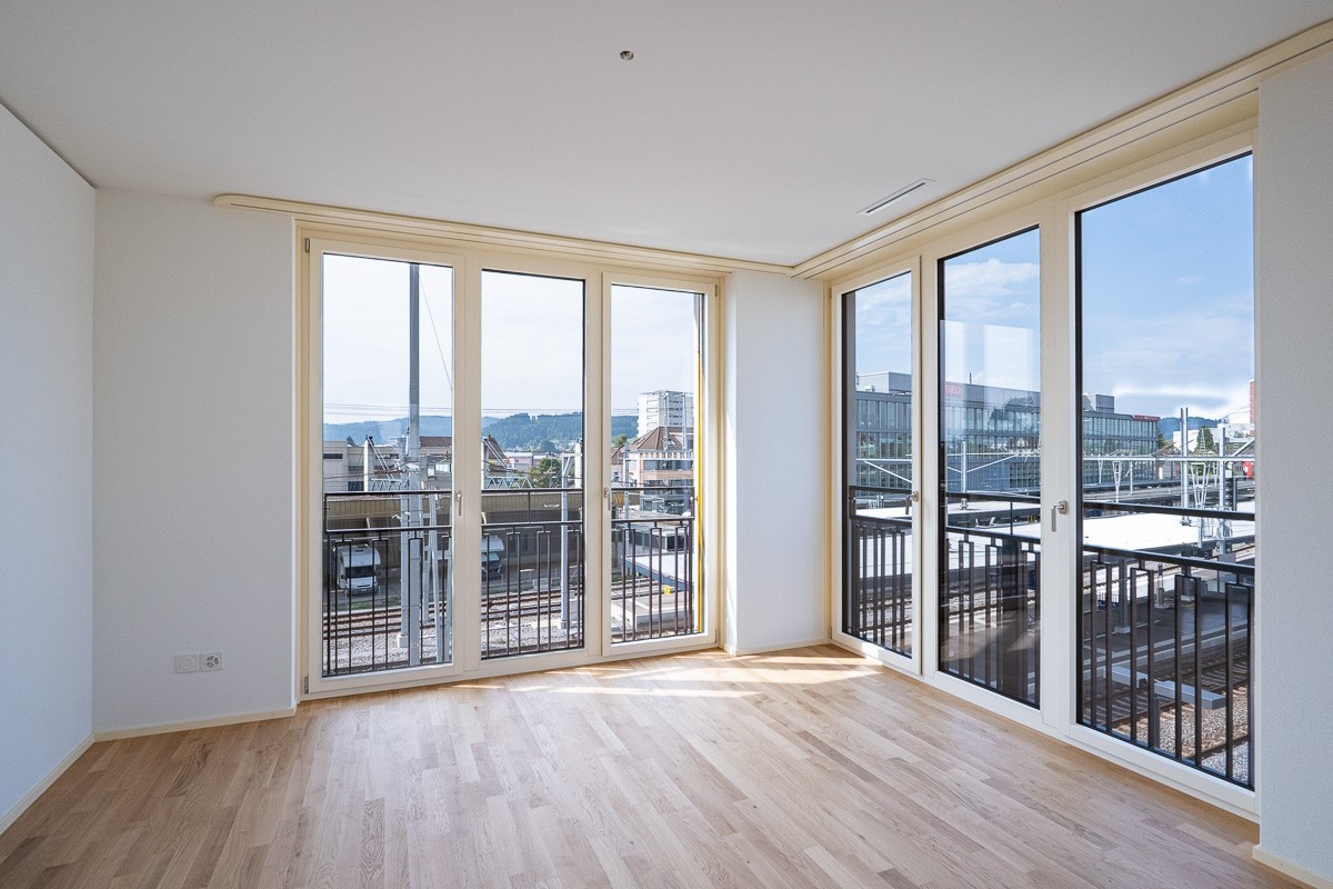 Die Wohnungen sind hell, durchdacht geplant und hochwertig ausgestattet. Die oberen Stockwerke bieten freie Sicht auf das Geleisefeld mit traumhaftem Panorama auf die Churfirsten und den Alpstein.