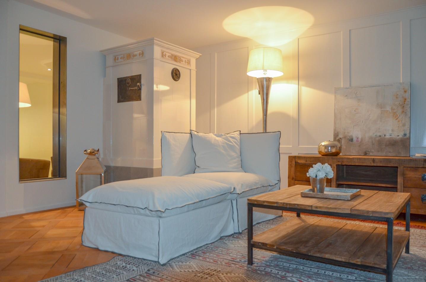 + Wohnzimmer mit antikem, restauriertem Kachelofen