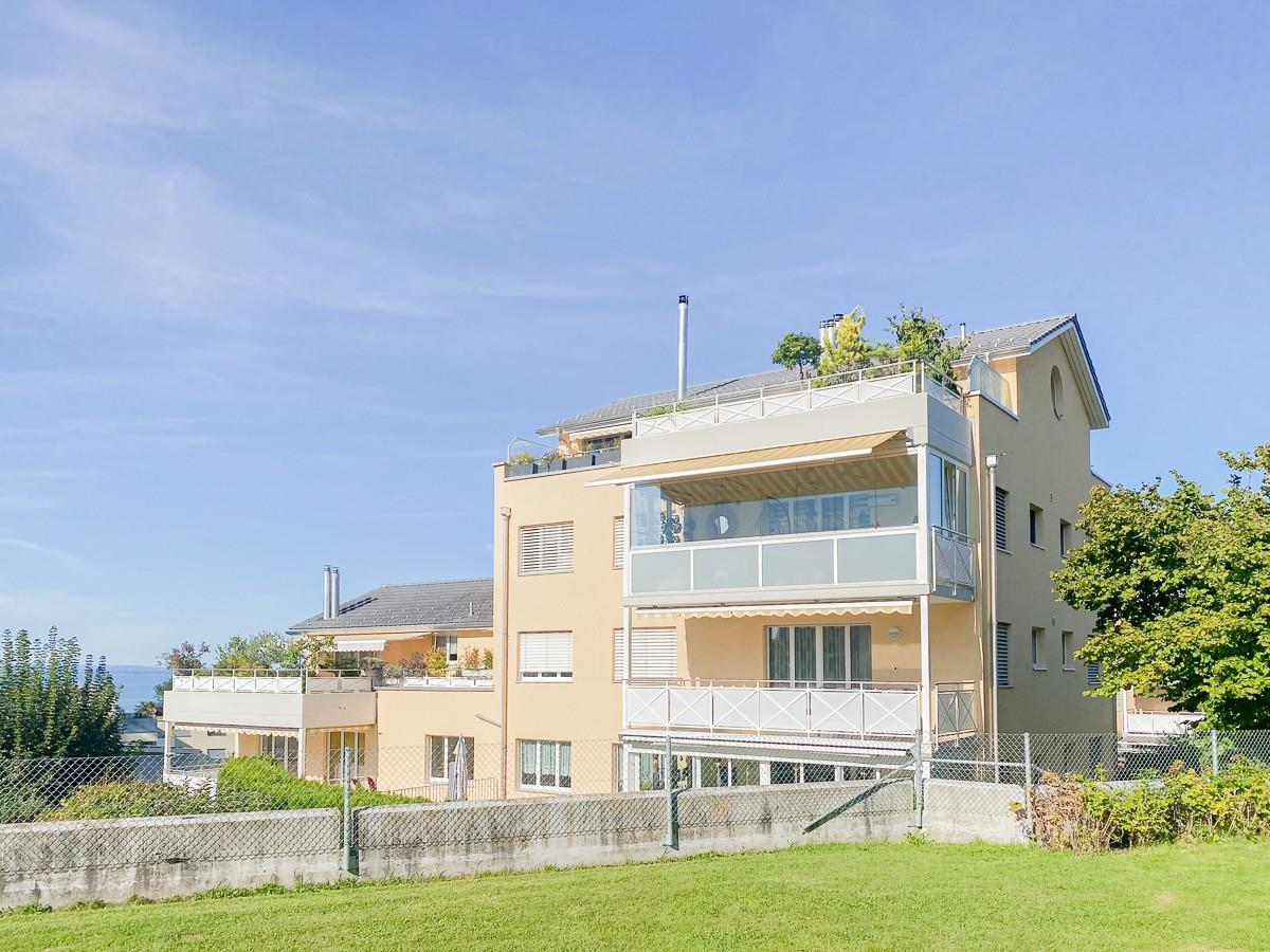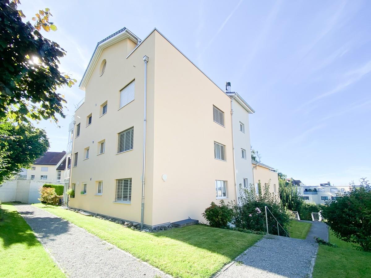 Die Liegenschaft wurde 2002 erbaut und befindet sich in gut unterhaltenem Zustand. Die Zimmer sind von drei Seiten belichtet. Der Wohn- und Essbereich ist gegen Westen ausgerichtet und erschliesst einen grosszügigen Balkon. Die Küche ist abgeschlossen und teilweise ist eine Seesicht gegeben. Zur Liegenschaft gehören fünf Zimmer, zwei Nasszellen, ein Balkon, eine Waschküche, ein Kellerabteil und zwei Tiefgaragenplätze im Untergeschoss.