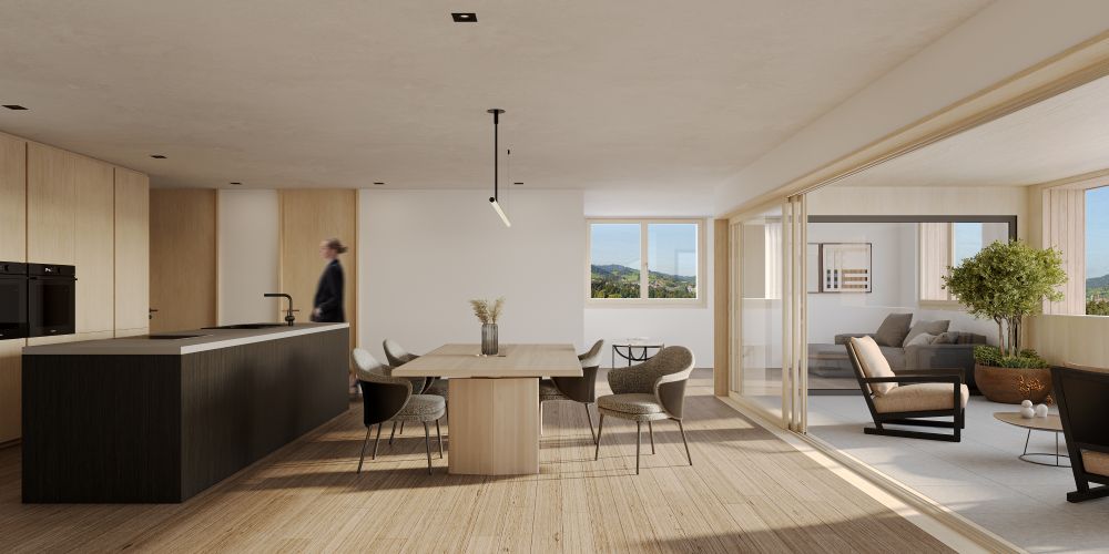 Über die Zufahrt gelangt man in die Sammelgarage mit 8 Parkplätzen. Für Gäste steht im Aussenbereich ein Besucherparkplatz zur Verfügung. Ein zentrales Treppenhaus mit Liftanlage, welches direkt neben der Garage liegt, erschliesst alle Wohneinheiten und Nebenräume komfortabel und barrierefrei.