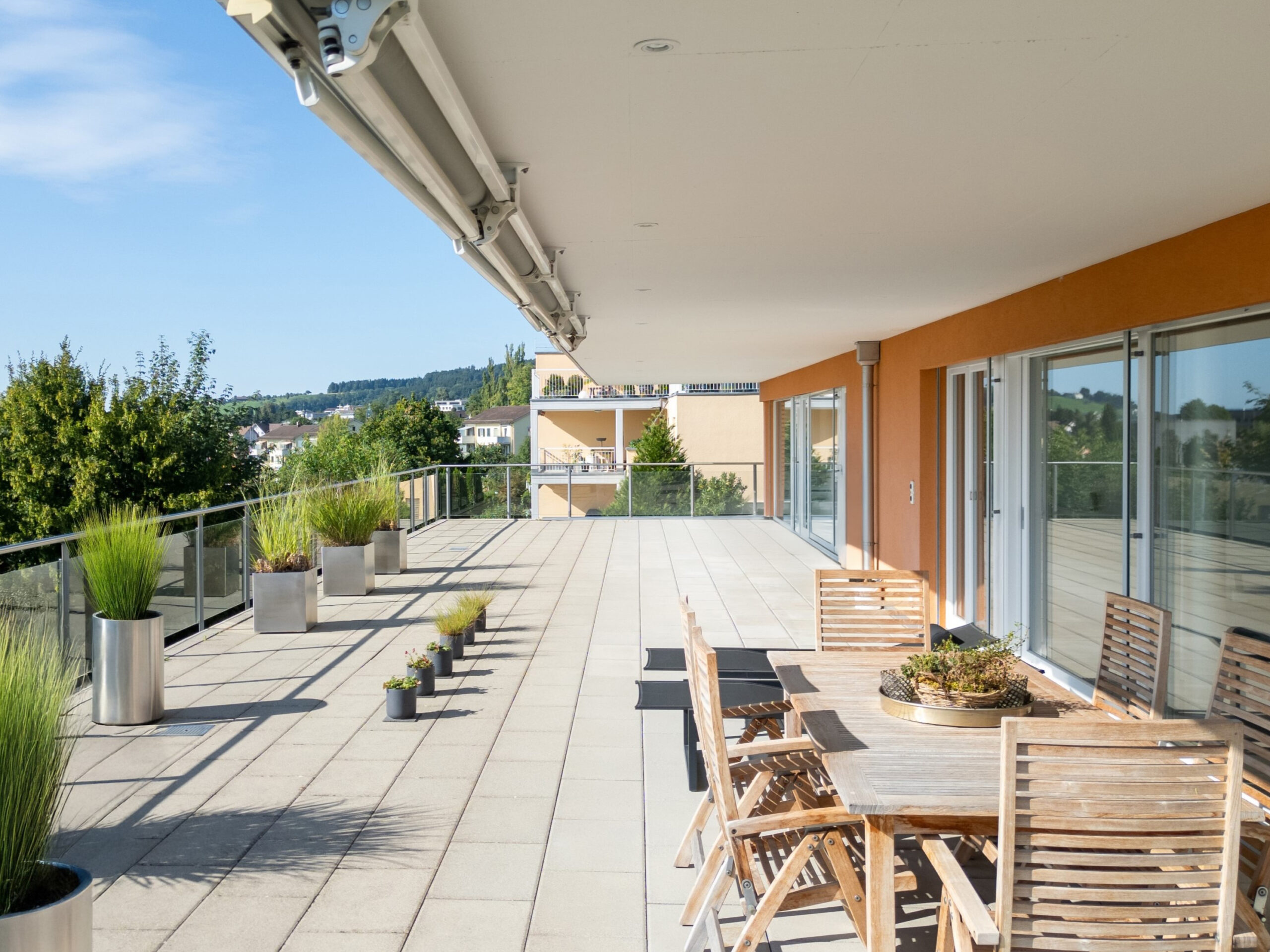 Diese traumhafte 5.5-Zi. Terrassenwohnung im 2. OG vereint modernes Wohnen mit höchstem Komfort. Das Highlight ist die grosszügige, teilweise gedeckte Terrasse mit 120 m², Westausrichtung und wunderschönem Panoramablick.